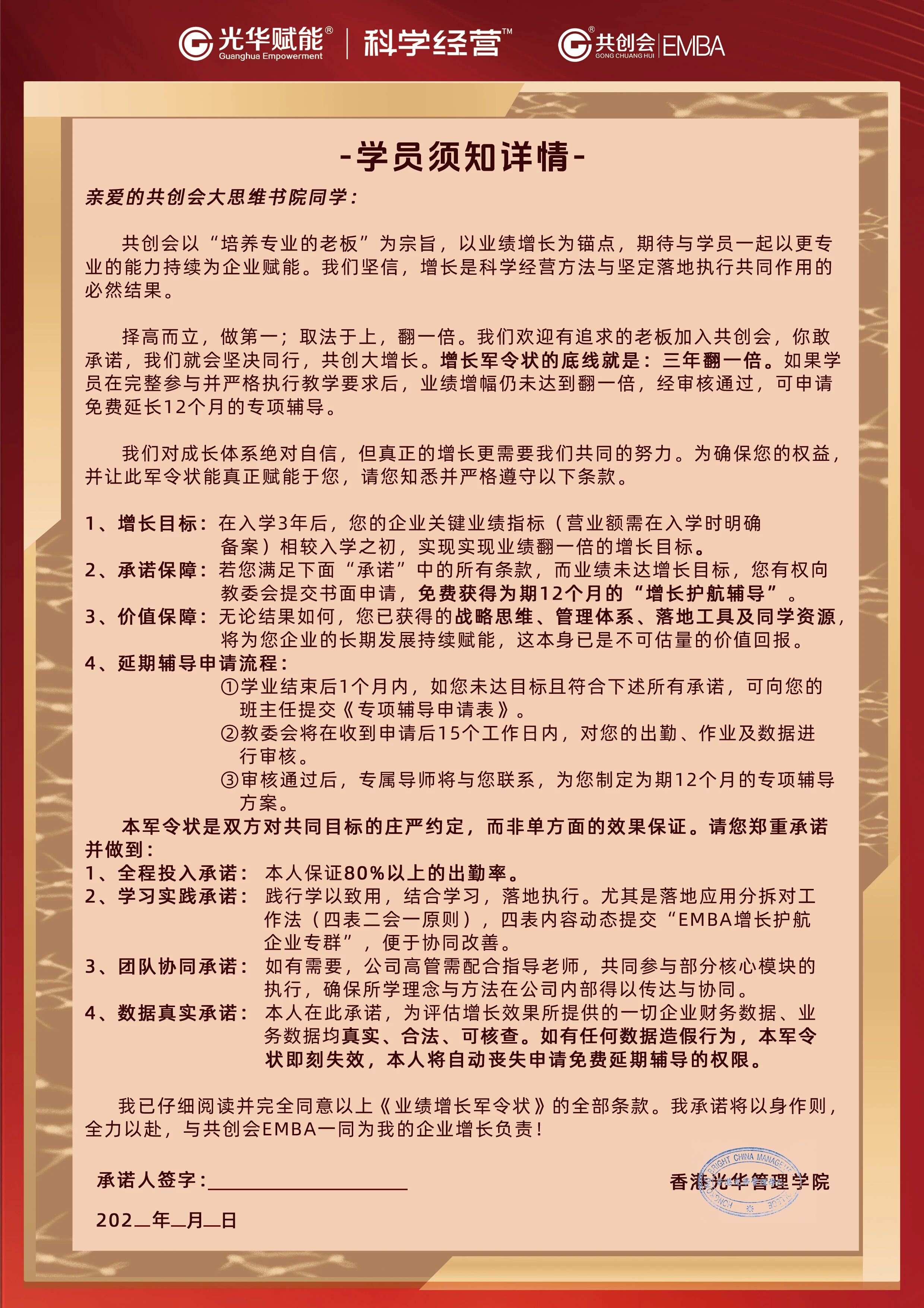 3、認可光華共創會EMBA入學協議條款,遵守共創會EMBA學員規范;