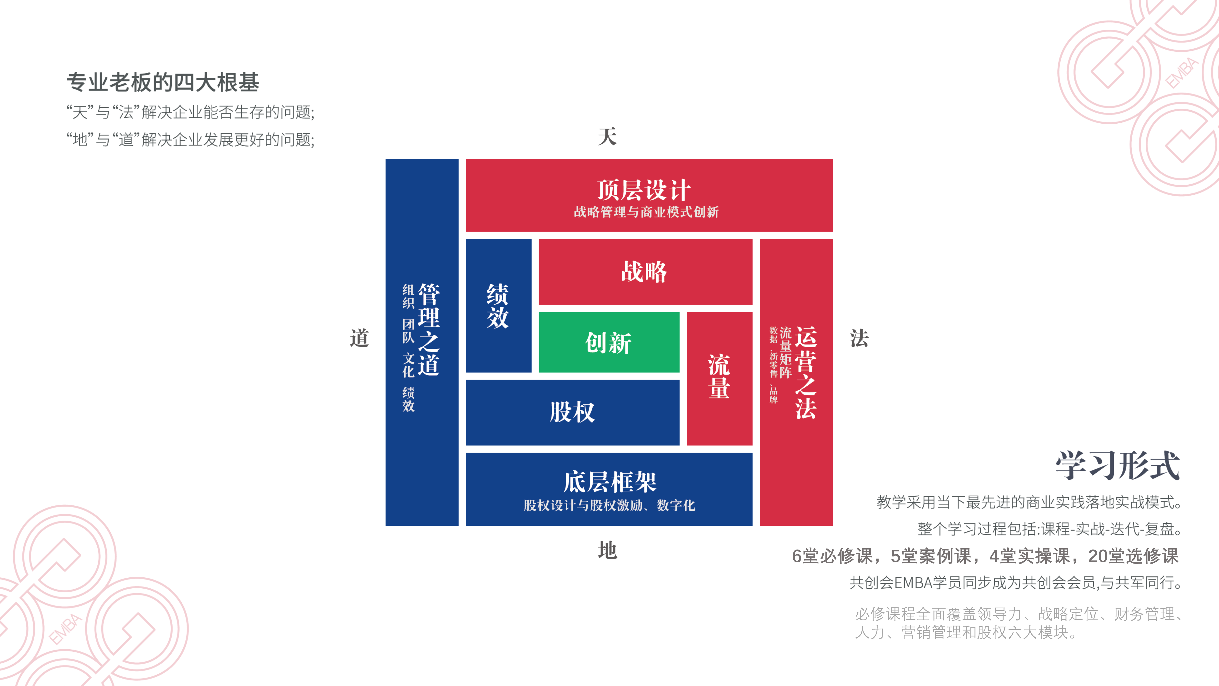 6大必修課:覆蓋戰略定位、股權、人力、財務管理、領導力和產品創新六大模塊;